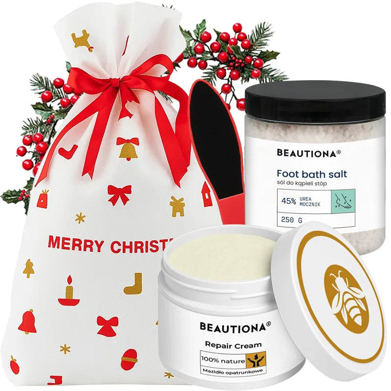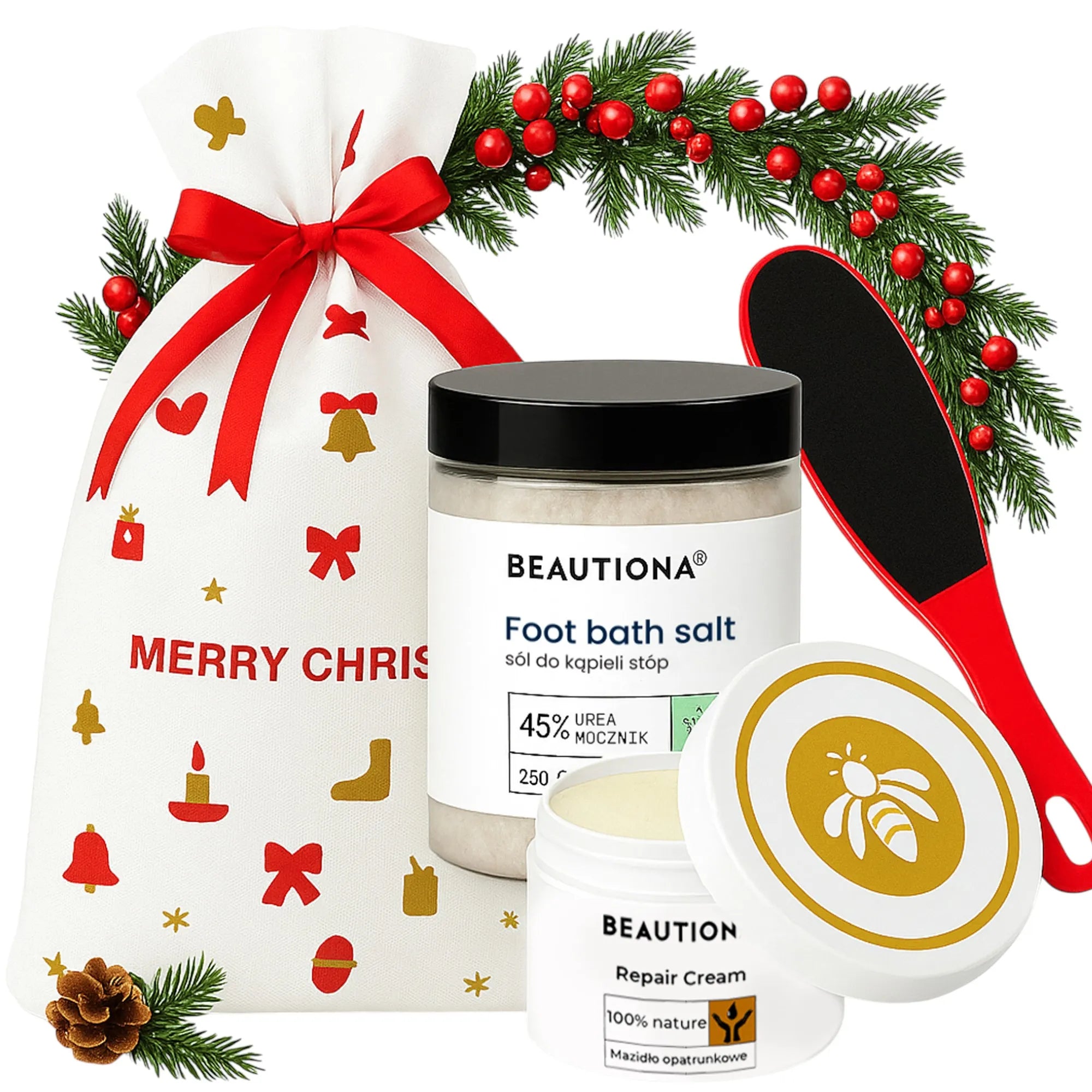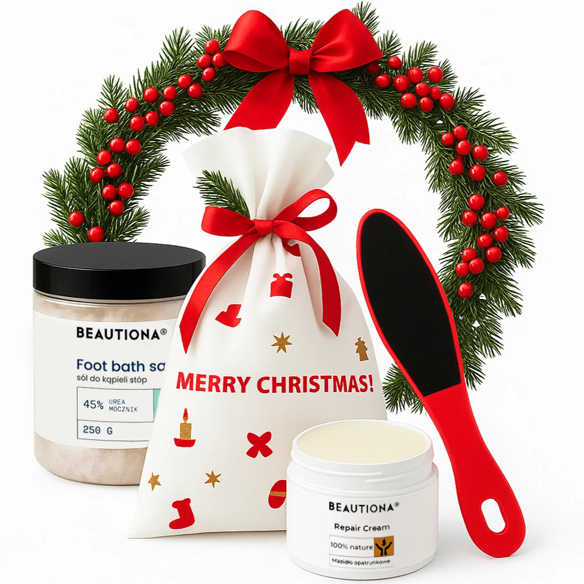 Složení sady: sůl na nohy s močovinou 45 % 250 g, mast na rány 50 ml, mini struhadlo na nohy, vánoční sáček (barva zasílána náhodně)