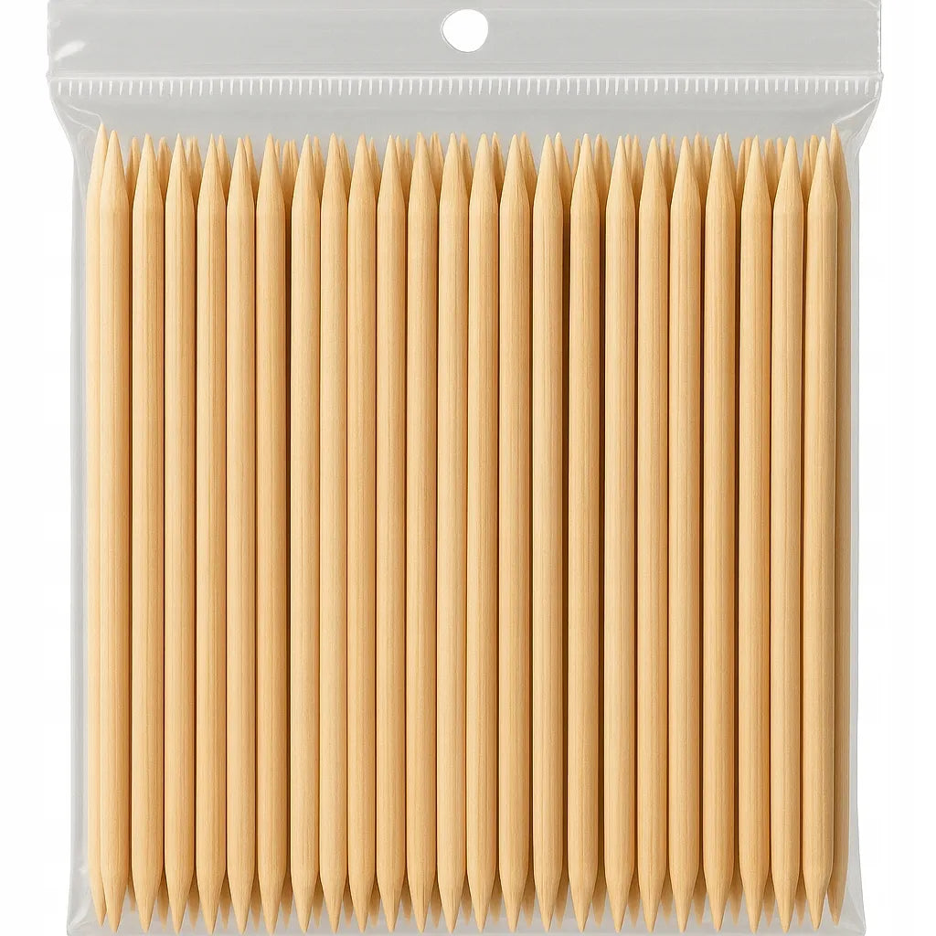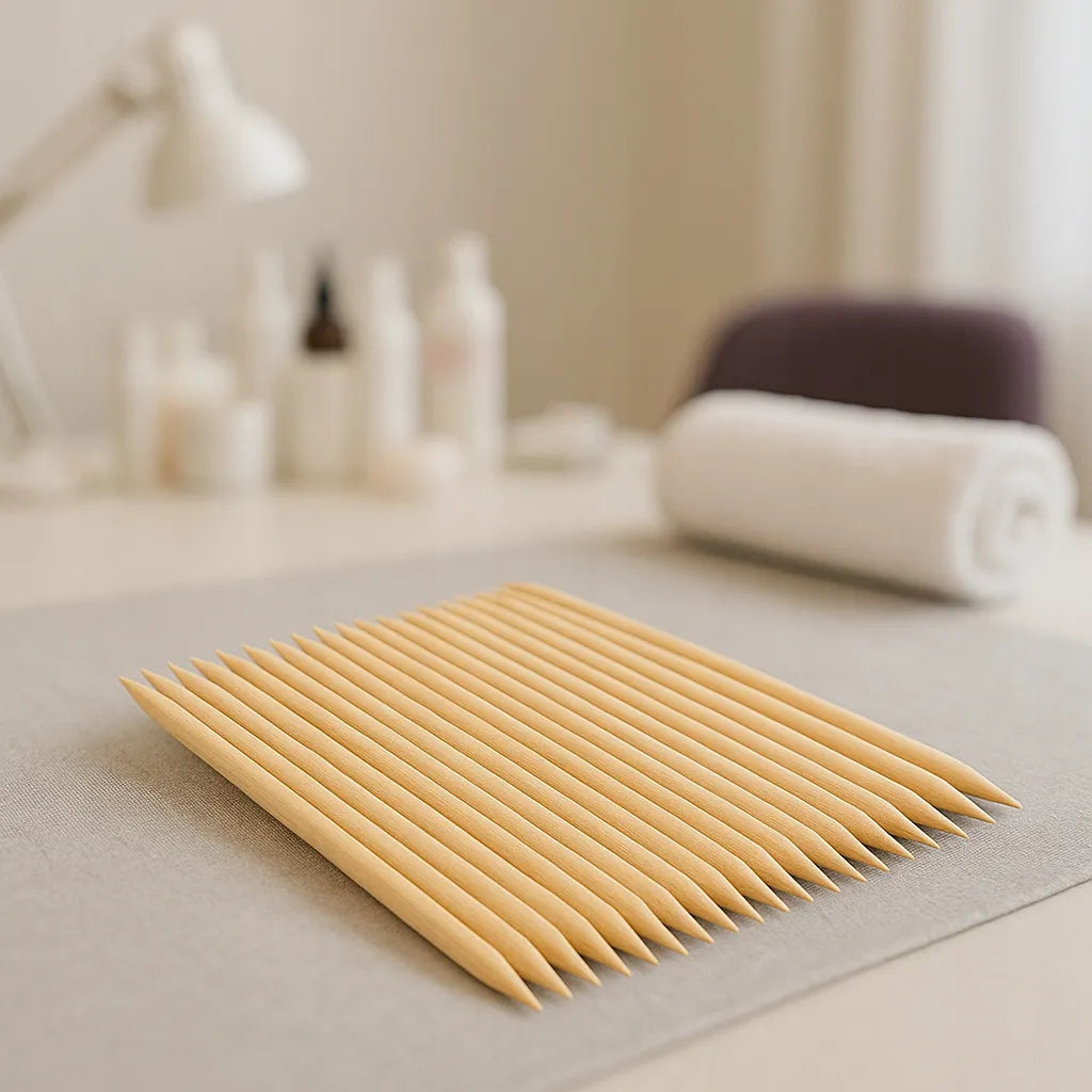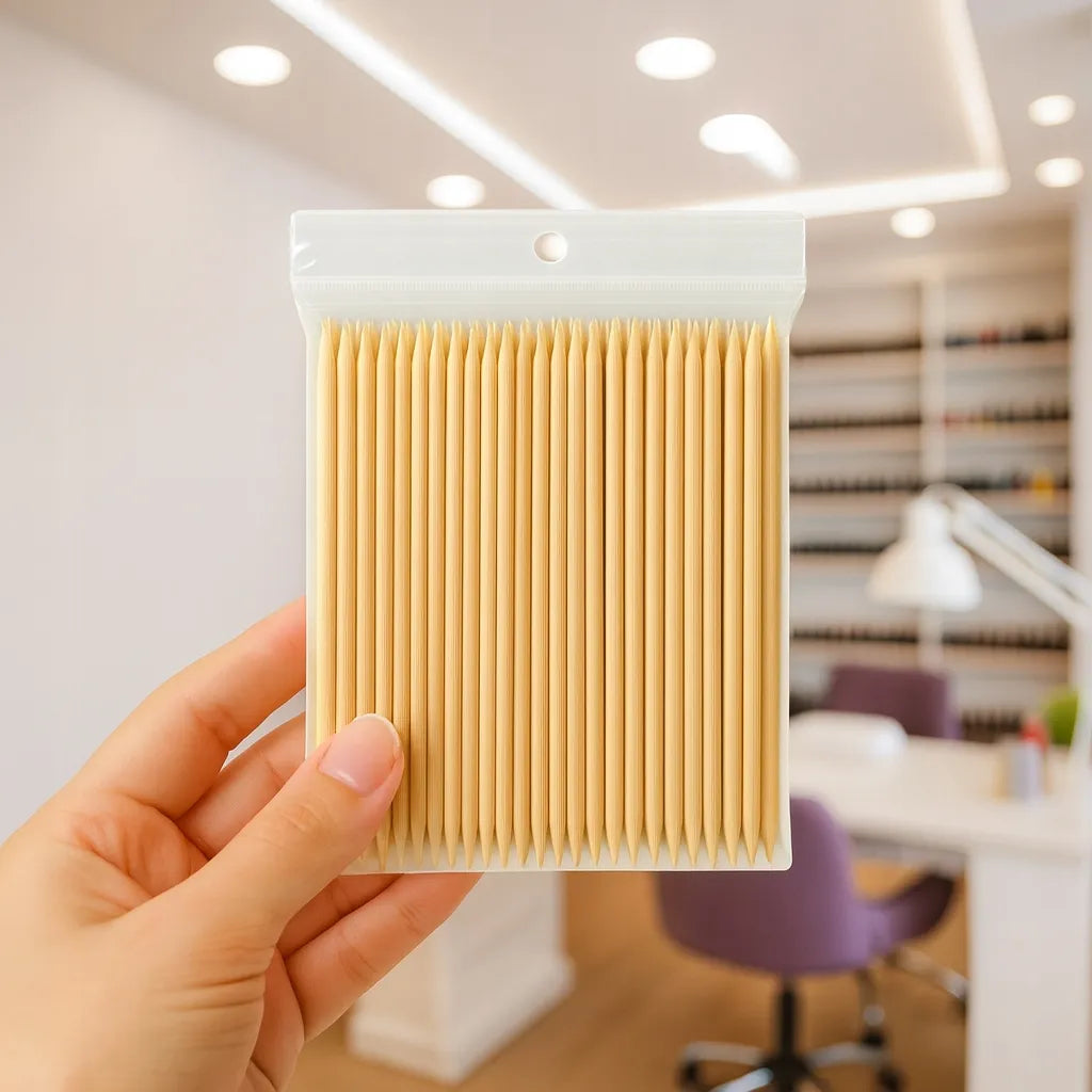 Vyrobeno z oranžového dřeva. Se dvěma různými konci (plová špička a špička). Abych zatlačila kůži z nehtů. Lze je také použít k odstranění rozlitého gelu nebo hybridního laku z nehtové kůže. Mají všestranné aplikace a jsou velmi hygienické.