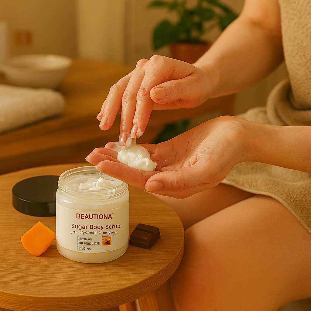 Objevte hýčkající péči s naším cukrovým peelingem s vůní dýně a čokolády. Přírodní složení čistí, vyhlazuje a vyživuje pokožku, zlepšuje její pružnost a podporuje vstřebávání aktivních látek z každodenní péče. Mandlový a ricinový olej zajišťují intenzivní hydrataci a chrání pokožku před vysušením – pro sametově jemný a hebký pocit již po prvním použití.