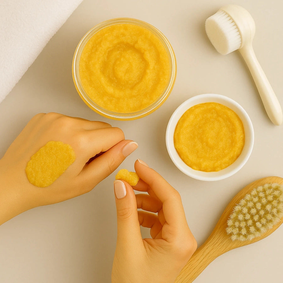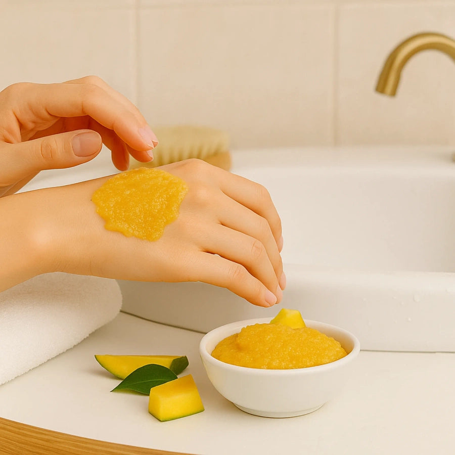 Objevte tropickou péči s naším cukrovým peelingem s vůní šťavnatého manga.