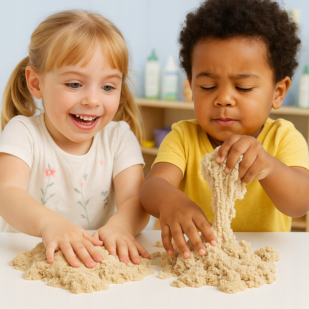 Nasypte písek na tác nebo senzorickou podložku. Mačkejte, tvarujte, rozdělujte nebo roztahujte – sledujte, jak jemně protéká mezi prsty. Využijte formičky, válečky, nože a další nástroje k tvorbě staveb a tvarů. Kombinujte různé barvy pro zajímavé efekty. Po hře jednoduše shrňte písek k sobě – snadno se spojí zpět do jednoho celku.