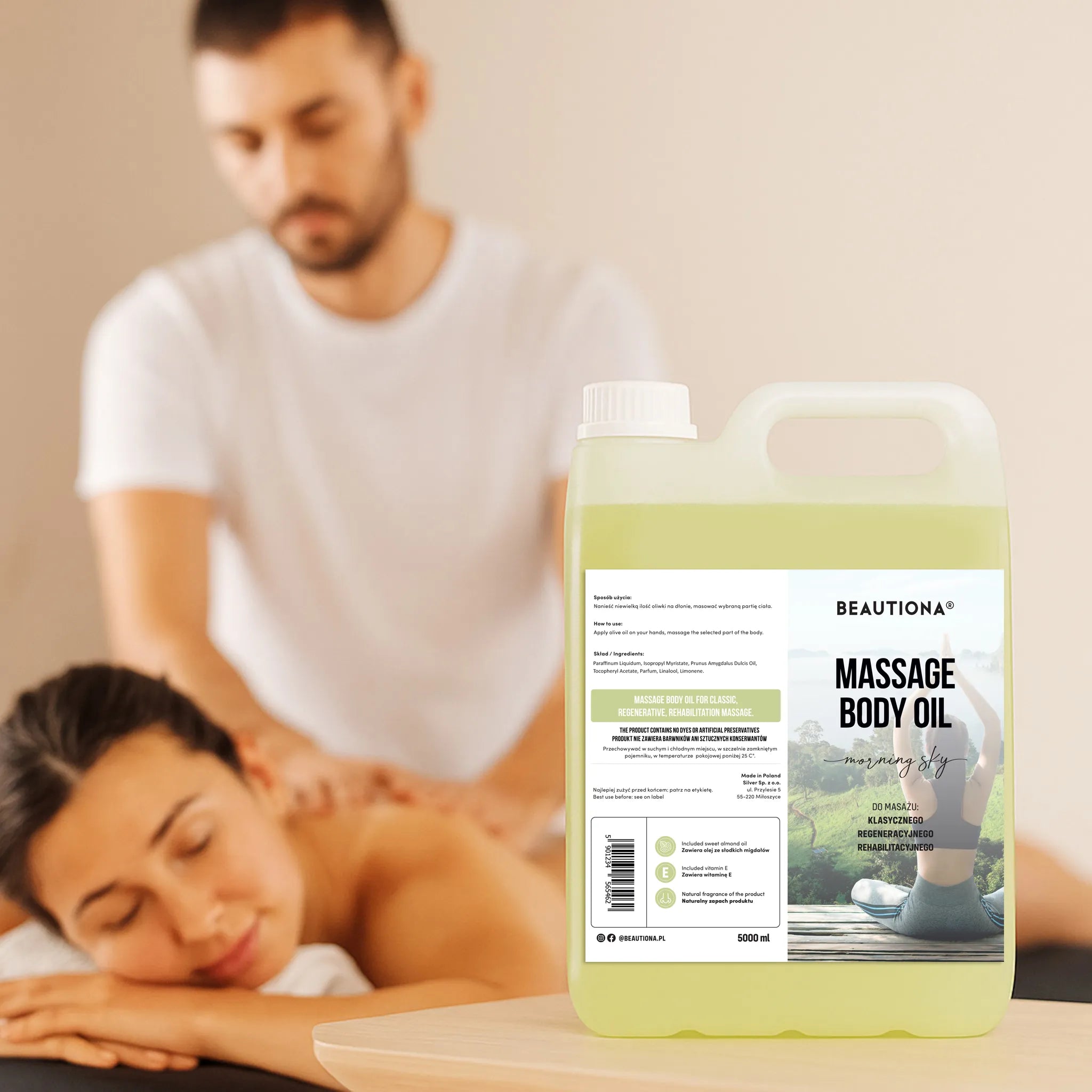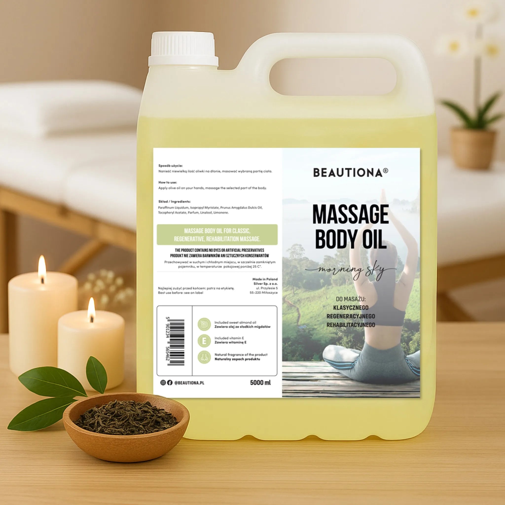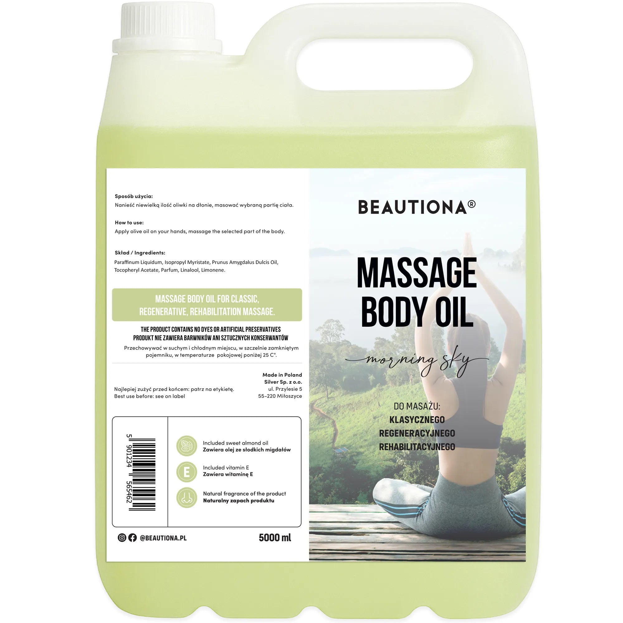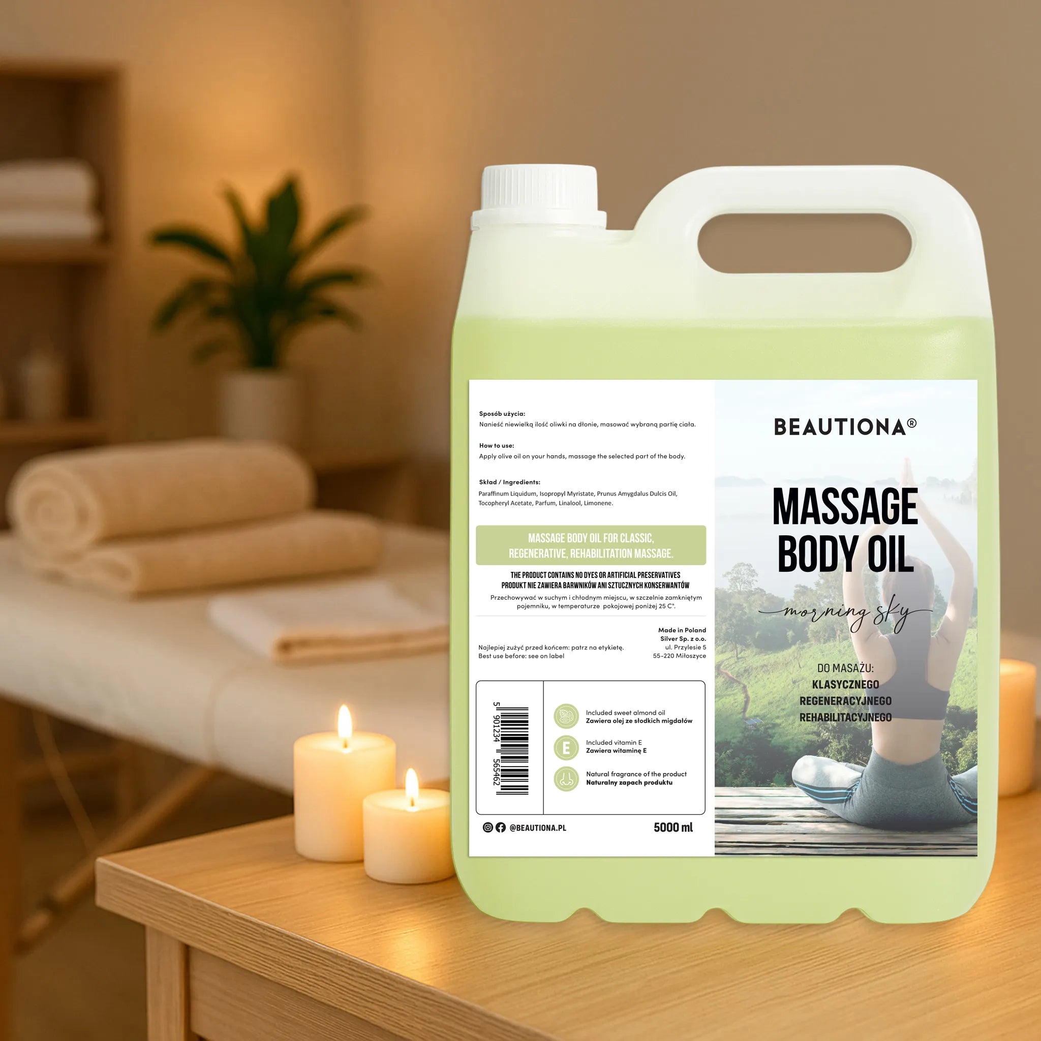 Masážní olej BEAUTIONA Morning Sky 5000 ml je profesionální olej určený pro masáže celého těla, obličeje, krku a dekoltu. Díky obsahu přírodního mandlového oleje intenzivně hydratuje, zjemňuje a zvyšuje pružnost pokožky. Vitamín E působí antioxidačně, zpomaluje stárnutí pokožky a pomáhá zklidnit drobná podráždění. Hedvábná konzistence zajišťuje výborný skluz rukou a usnadňuje dloużsí masážní techniky. Jemná, svěží vůně Morning Sky navozuje pocit čistoty a relaxace – ideální pro salony, SPA i domácí wellness.