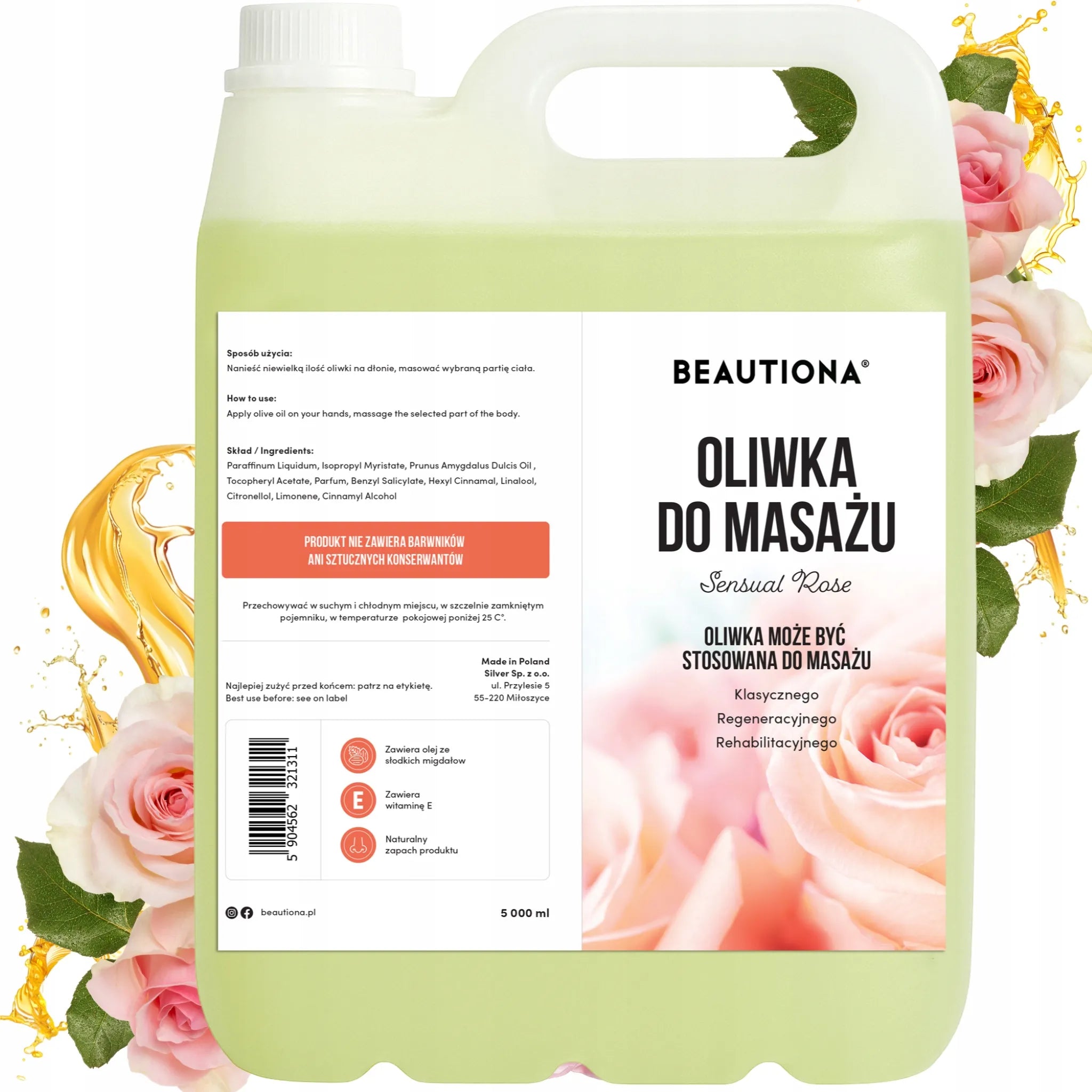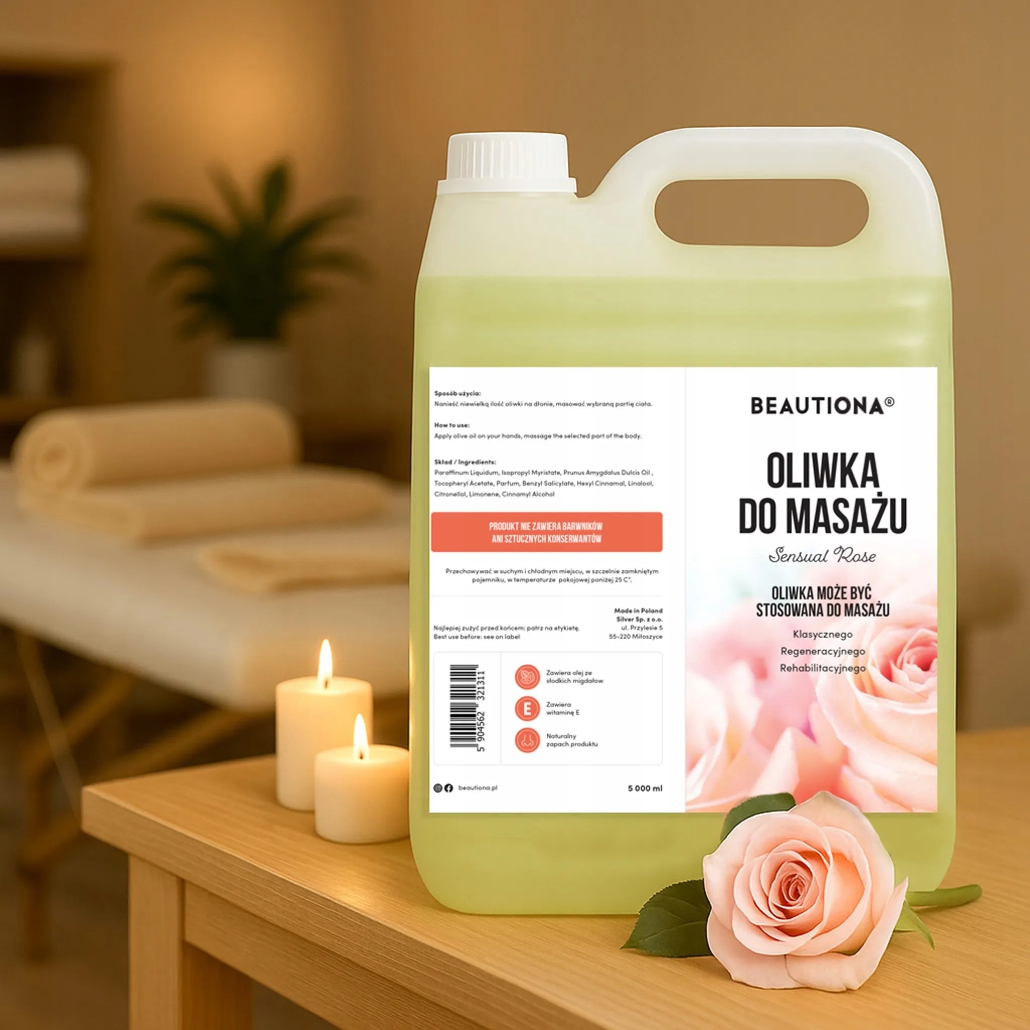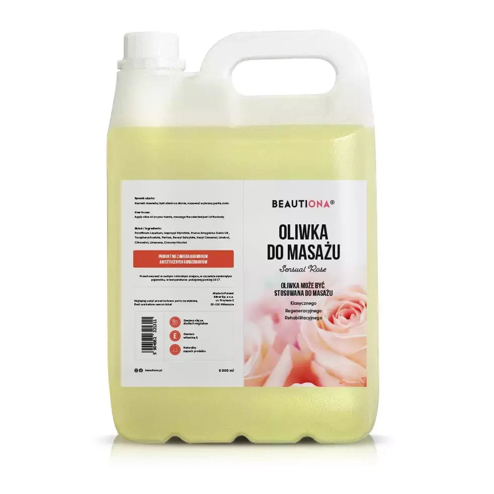 Masážní olej Sensual Rose 5000 ml – Beautiona přináší hluboké uvolnění a luxusní péči díky jemné vůni růže a hedvábné textuře. Obohacený o vitamin E a přírodní rostlinné oleje intenzivně hydratuje, zlepšuje pružnost pokožky a zanechává ji hebkou a vláčnou. Ideální pro relaxační, wellness i pečující masáže – v salonu i doma. Velké balení 5000 ml je perfektní pro SPA a kosmetické provozy.