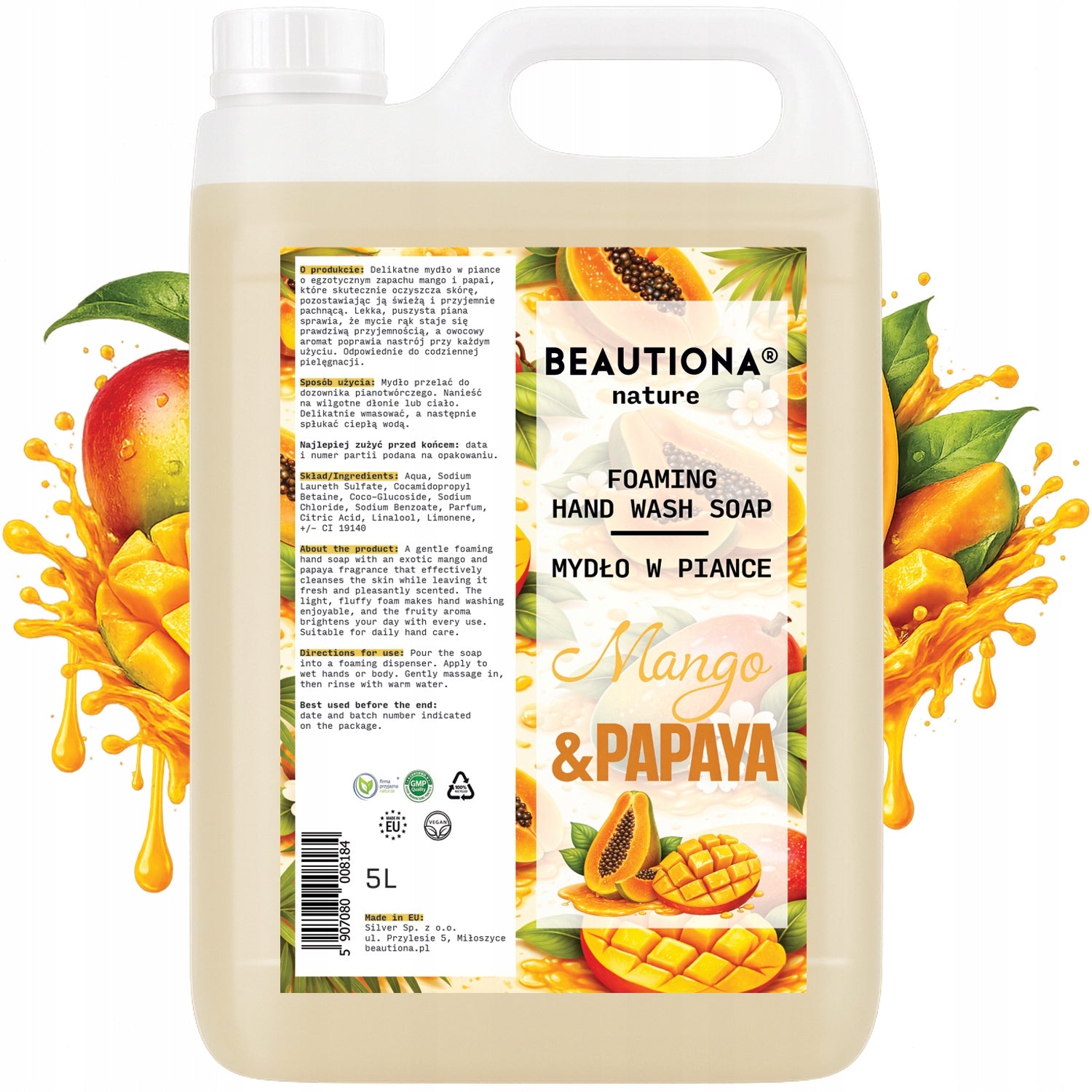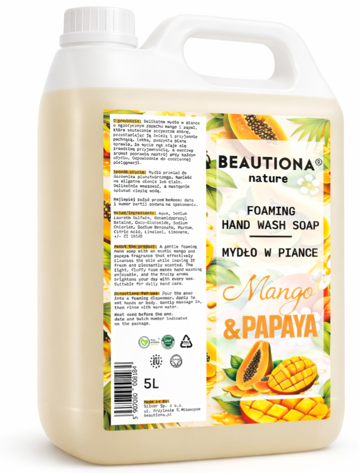 Pěnové mýdlo BEAUTIONA® Mango & Papaya 5000 ml je vydatná náhradní náplň do pěnových dávkovačů, která spojuje účinné mytí s příjemně šetrnou péčí. Lehká, nadýchaná pěna se rovnoměrně roztírá, snadno se oplachuje a zanechává na rukou tropickou vůni manga a papáji.