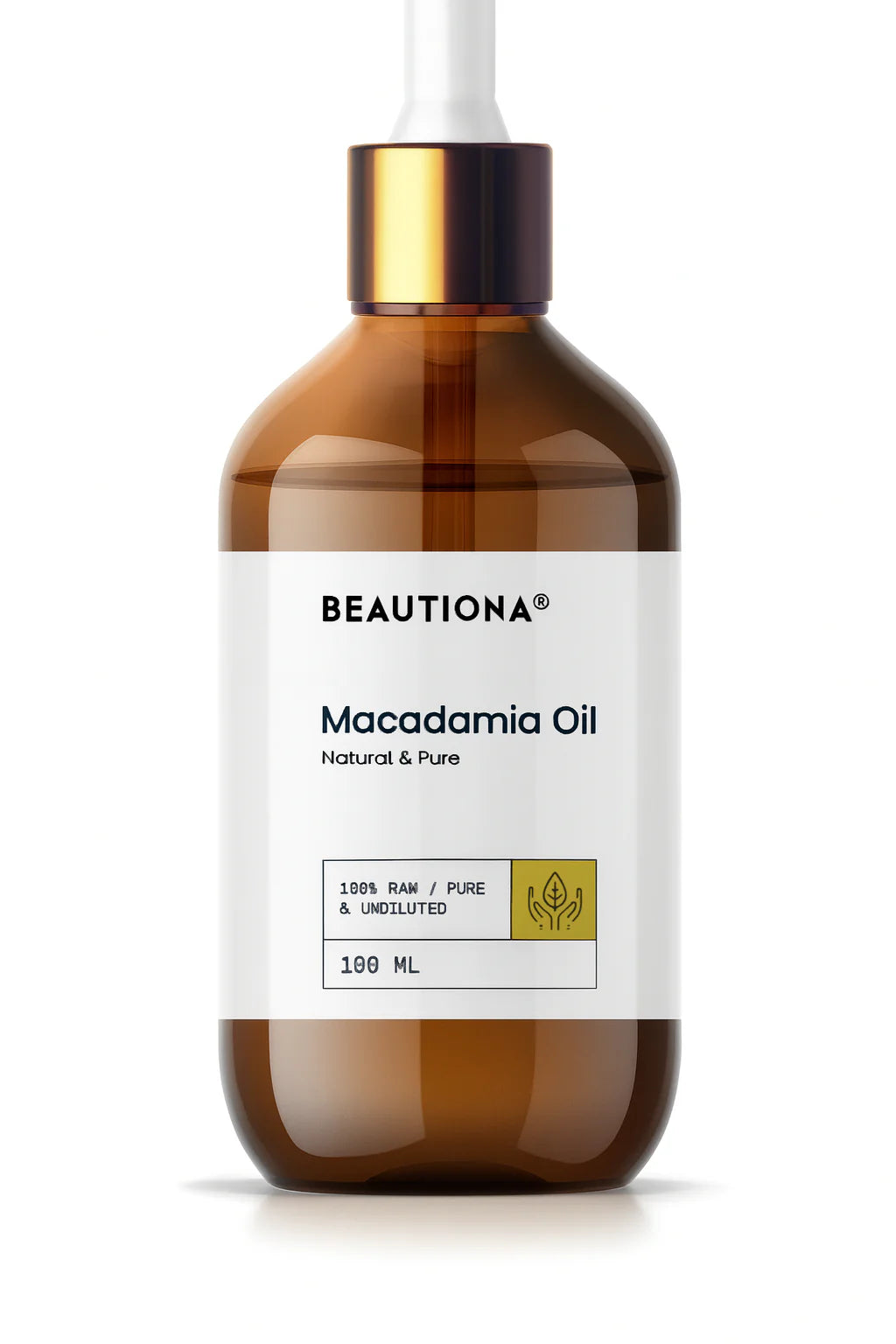 Přírodní makadamiový olej 100 % – Beautiona 100 ml je lehký, rychle se vstřebávající rostlinný olej pro péči o pokožku, vlasy i tělo. Díky vysokému obsahu nenasycených mastných kyselin a vitaminu E pokožku intenzivně hydratuje, vyživuje a chrání před vysušováním, aniž by zanechával mastný film. Vhodný i pro citlivou, suchou a dehydrovanou pleť, protože má čisté, 100% přírodní složení bez silikonů, barviv a parfemace.